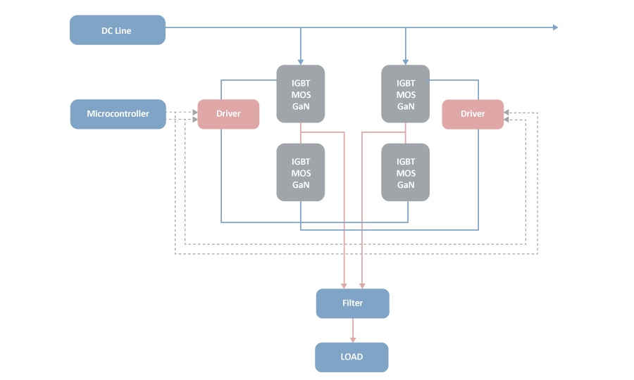 As depicted in the block diagram, IGBTs, MOSFETs or GaNs are mainly employed as a “Switching Component” and considered a basic building block of the inverter. A PWM or SPWM based input signal is generated using a Microcontroller which controls ON/OFF state of IGBTs/MOSFETs/GaNs.