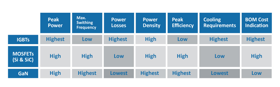 The qualitative overview of IGBTs, MOSFETs or GaN in inverter applications is shown in the matrix below. This comprehensive overview of strengths and weaknesses can help to identify application-specific performance parameters when considering them in a design.