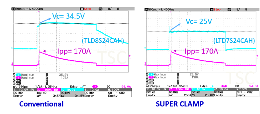 Additionally, the Super Clamp series can handle much higher pulse currents within the same package size i.e., ~300A in DO-218AB versus 170A for traditional TVSs. In other words, under the same voltage conditions, a single Super Clamp device can deliver the current capability equivalent to that of two conventional TVSs. This allows for significant PCB space savings when using Super Clamp.